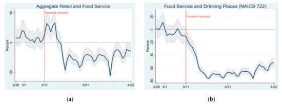 Dunn et al. [] have estimated consumer spending by using data relating to daily card transactions in the USA—they confirmed that there was a reduction in consumer spending in March 2020 (Figure 6). Approximately 5% of this reduction regarded retailers, and it continued until April 2020; the trend in transactions in food and beverage service providers also experienced a downward trend. Moreover, these events occurred as the WHO officially declared a global pandemic on 11 March 2020, as shown below by the red vertical line.