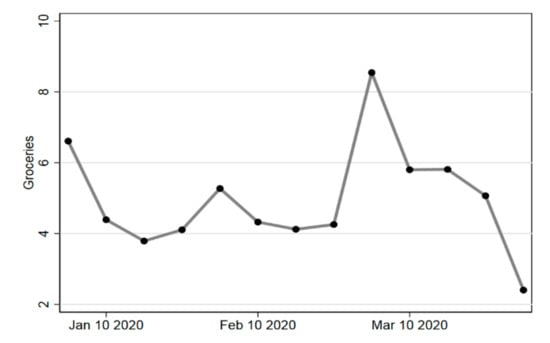 Baker et al. [] examined the financial transaction data of American households during the January–March 2020 pandemic period—the results confirmed that grocery spending was in sharp decline (Figure 7).