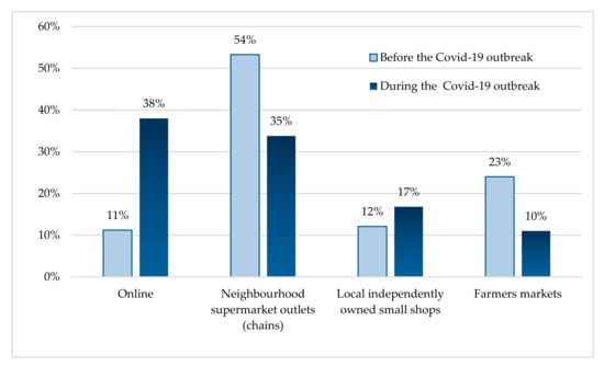In accordance with various quarantine rules, the opening hours of shopping centres around the world have been reduced or definitively closed []. A burgeoning demand for food products during the lockdown has affected online food deliveries, with some either being delayed or on occasion not shipped. Empirical results from bank card transactions in France = confirmed that shopping online somewhat reduced the pandemic shock []. Countries such as the United Kingdom have reduced restrictions on the delivery times of some food retailers as they attempt to restock the shelves with basic foodstuffs. Some supermarkets have also expended efforts in preventing overcrowding on their premises and the consequent spread of the pandemic by offering free delivery []. Beyond Europe, China’s offline consumption decreased by RMB 1.22 trillion (renminbi (RMB), the currency of the People’s Republic of China (PRC)) during the three-month post-outbreak period (February–April 2020), thereby losing 1.2% of 2019 GDP []. Still in Asia, the results of the research by Chauhan and Shah [] in India have highlighted that the majority of surveyed consumers modified their shopping behaviour (77%), with 50% now engaging in mixed-mode buying (e.g., online and in-store). Empirical results by Li et al. [] revealed that Chinese supermarkets remained a popular choice during January–February 2020 (as confirmed by 35% of survey respondents), with online food shopping becoming the most popular (38%) (Figure 8).