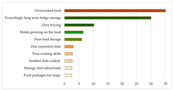 Jribi et al. [] have referred to the socio-economic aspects of food security in periods of quarantine and reducing incomes due to issues of unemployment. Moreover, Hubbub [] has also contributed to studies in this area—it asserts that, due to restrictions of movement and concerns regarding the cost of many foodstuffs, many U.K. consumers have begun to re-evaluate their attitude towards food (57%) and expending efforts to waste less food than would typically be the case (48%). In this regard, the survey by Grant [], involving more than 3000 consumers in 15 countries, revealed that more than two-thirds of the respondents focused on limiting food waste during the implementation of stay-at-home orders. According to past studies of consumer behaviour [,], and the results of research conducted during the pandemic, the prevention of food wastage is more related to personal benefits than environmental concerns. The evaluative results of Jribi et al. [] regarding food wastage during the two first weeks of COVID-19 outbreak lockdown in Tunisia (commencing 20 March 2020) revealed that the majority of wasted food concerned bakery products, followed by fruit and vegetables. In contrast, the wastage of seafood and fish, meat products, and oilseeds was minimal. The results of the research by Jribi et al. [] also specified the rationale for food wastage during the same period was due to overcooked food, exceedingly long-term storage in the freezer, overbuying, etc. (Figure 9).