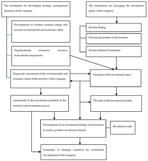 The presented study, as an important component of the strategic management system, distinguishes precisely investment policy, its close linkage to the enterprise ecosystem, and the security of the territory of operations, which is also associated with the introduction of environmentally friendly or acceptable technologies. At the same time, these advanced and safe technologies provide an economic effect and contribute to the sustainability of the company. The works of S.G. Kalinin, V. Tribushnaya, and other scientists presented approaches and methods for forming investment strategies and optimizing the structure of investment capital [32]. In particular, when modeling the mechanism of managerial decision-making, it should be possible to pre-identify and correctly respond to emerging gaps in the process of strategy implementation. These gaps appear when an insufficiently accurate risk assessment is made, when the technologies do not meet the environmental requirements, and the investment potential does not meet the needs of the enterprise.