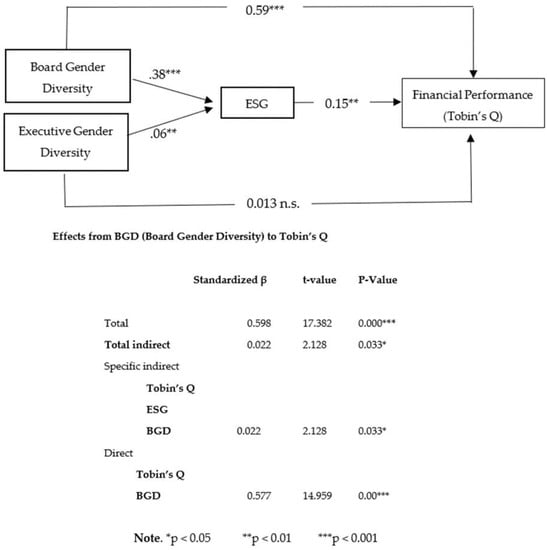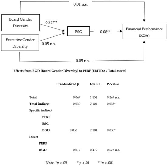 In summary, as shown in Figure 1, when women were more represented on the board, financial performance increased (1 for 0.59). Almost 4% (0.022/0.59) of this effect was achieved through ESG orientation. However, the representation of women on the EC did not affect performance. Furthermore, as shown in Figure 2, the robustness test also confirmed the mediating effect (indirect effect) of ESG in the relation between gender diversity on the board and financial performance measured by the “PERFORM” proxy. Thus, hypotheses H1a and H2a are supported while H1b and H2b are not. In addition, the model explains 52.20% of the variance in financial performance measured with Tobin’s Q.