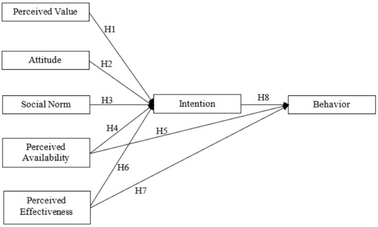 The TPB was used as the based model for this research, as shown in Figure 1. One new construct, perceived value, is added to the model, as perceived value may influence behavioral intention [49,50,51].