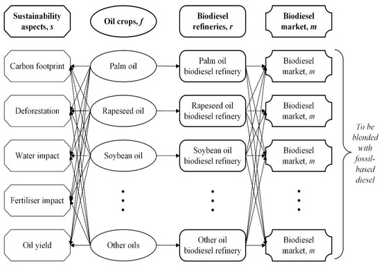 From the literature, multiple alternative resources have been investigated to improve sustainability performance in biodiesel production. The majority of the researchers investigated the integration of alternative non-edible and renewable oil sources and compared the sustainability performance with the conventional approach. However, a recent study shows that different types of oil (e.g., palm oil, rapeseed oil, soybean oil, etc.) have different sustainability index profiles due to the variation in plantation practice and generation yield [17]. For instance, in the comparison of sustainability performance between palm oil, soybean oil, rapeseed oil and sunflower oil, the study suggests that the production of palm oil has the highest sustainability index profile in land usage due to the relatively high oil generation yield, but performs poorly in deforestation and carbon footprint, while soybean oil production requires the most land, but has the least impact from fertiliser usage. There is no single renewable source that is able to perform well in all the sustainability index profiles. Nonetheless, utilisation of multiple oil crops as process feed has shown significant improvement in the overall sustainability index profile [17]. Additionally, a detailed review of various direct transesterification processes has shown that the majority of the existing technologies are capable of handling a diverse feedstock type [18]. In view of that, there is a research gap to investigate a biodiesel supply chain network that incorporates diverse feedstocks to create a balanced and optimum feedstock sustainability profile. This is critical to address the concern of sustainability issues from high dependence on specific oil crops in biodiesel production, such as extensive deforestation activity from the palm oil plantation or high land usage from soybean plantation. Additionally, diversifying the feedstock could improve the supply chain security issue [19].