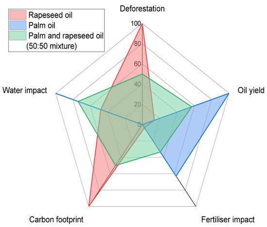 Sustainability index profile (in %) comparison between various types of oil crops [17].