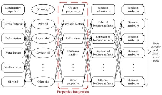 Figure 3 shows the proposed model in this paper. The model introduces a novel oil crop selection approach based on bio-oil properties. Instead of limiting specific oil crops as the feedstock of each refinery, the proposed model provides the flexibility of integrating multiple types of oil crops into the existing biodiesel refineries. In order to avoid significant fluctuations in the operation and performance of the biodiesel refineries, only a specific range of bio-oil properties will be accepted in each refinery. This is defined as the properties acceptance range in the context of this paper. The proposed properties acceptance range will be constructed based on the feed properties that would have significant impacts on the production yield and biodiesel quality. For example, the free fatty acid content is considered in this study as part of the feed selection criteria due to the direct influence on the performance of biodiesel production [32,33]. Apart from that, the stability of the oil crop and the produced biodiesel is another critical factor in ensuring consistency of the oil and biodiesel quality within the supply chain network. For instance, a study shows that crude palm oil has a shelf life of approximately six months [34]. Iodine value is used to determine total unsaturation within the fatty acid which influences the oxidation stability of the oil crop and the produced biodiesel [35,36,37]. Estimation of those properties in an oil crop mixture has been proven to correspond to the mixing ratio of the oil crops used in the biodiesel production [38]. These properties would be included as part of the feed selection criteria in the proposed supply chain model to ensure adequate stability of the oil crop and produced biodiesel. Incorporating the feed selection criteria based on the oil crop properties increases the flexibility of the supply chain model to determine the best combination of oil crop utilisation to achieve a feasible and optimal system.