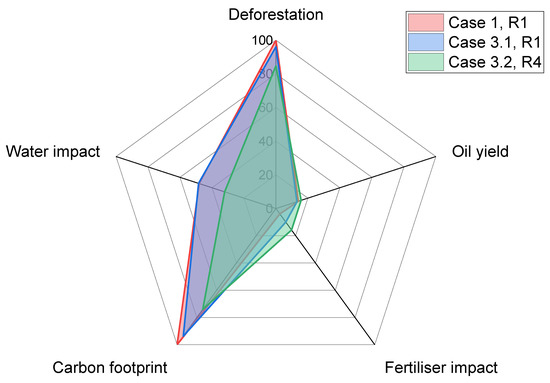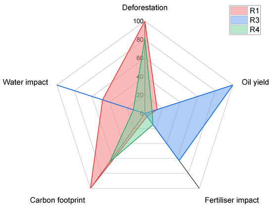 This section describes the result obtained for Case 1 where the optimum solution is obtained with the minimum overall cost of production at USD 6.57 billion·y−1 to fulfil the market demands. Table 8 shows the selection of oil crops for each refinery, where only the conventional type of oil crop was selected as feed. The result demonstrates that the limitation of the conventional supply chain model was not able to integrate the mixing of multiple types of oil crops as the process feed. In addition, no production was proposed in R2 due to the relatively higher transportation cost of transporting oil crops to R2 compared to R1. Figure 4 shows the sustainability profile of each refinery feed for Case 1 result. Due to the restriction of the feed selection, it is observed that the sustainability profile of the refinery feed was subject to the sustainability profile of the conventional oil crop type. This is an excellent example to reflect the current situation of biodiesel production. For example, R3, a palm oil-based biodiesel refinery, suffers from a critically low score in deforestation and carbon footprint. This has been a renowned issue in the industry for many years. However, it is a very challenging problem to be solved as it is difficult to control and educate a vast number of small- and medium-size plantation stakeholders to adapt to a more sustainable practice.