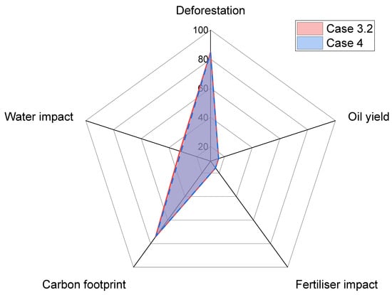 Case 2 considered in this study investigated the impact of integrating multiple types of oil crops as process feed to improve sustainability performance. The minimum cost of production was determined at USD 6.43 billion·y−1, approximately 2.2% lower than Case 1. Table 9 shows the feed distribution of the respective refineries. The result shows that the best feed for R1 and R3 remained rapeseed oil and palm oil, respectively. Interestingly, the feed for R4 was recommended to use the combination of rapeseed, soybean, and sunflower oil. The combination of feed enabled cost reduction due to the lower cost of soybean oil while fulfilling the properties acceptance range of R4. Since the objective of Case 2 is to minimise cost with the proposed properties integration, no significant improvement was found in the feed sustainability profile of each refinery as shown in Figure 5. The fertiliser and water impact indices have been improved to approximately 15% and 13%, respectively, compared to 4% in Case 1.