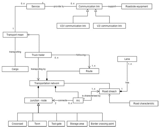 This research is related with results of some studies presented in previous works [,,,] in which we analyse the infrastructure of V2V communication and present the results of the multi-componential service provision for the cooperative vehicular networks. The issues of this area are related to the technology of the Internet of Things (IoT) [], which can work under conditions of wireless communication, by implementing the highest mobile technology of 4G (fourth generation) and 5G (fifth generation) protocols, and the functionalities of global positioning system (GPS), geographical information systems (GIS) and the analysis of big data warehouses []. However, the more in-depth description of such technological functions goes beyond the scope of the problems we examine, and thus our study has such limitations. Additionally, we are restricted our consideration on the area of the landscape transportation of cargo (freights) by roads, with the possibilities for the more extensional consideration of such processes under conditions of multi-modal transportation in future. The study does not cover at this stage the optimisation of traffic questions. These questions will be analysed in further studies.