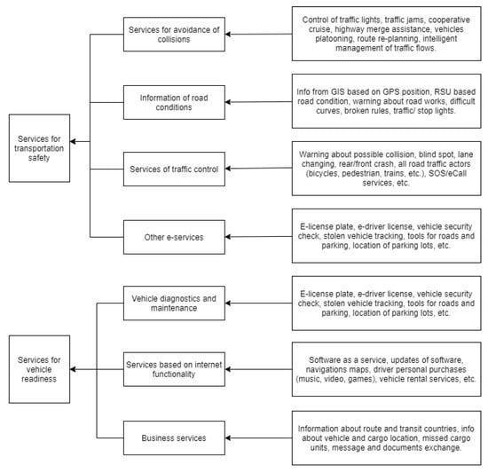 Service provision for vehicles by using VANET vary in a broad spectrum. By summarising types of services provided in works [,,,,], we would like to give the classification structure of services in Figure 2.