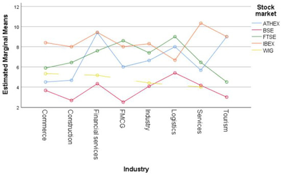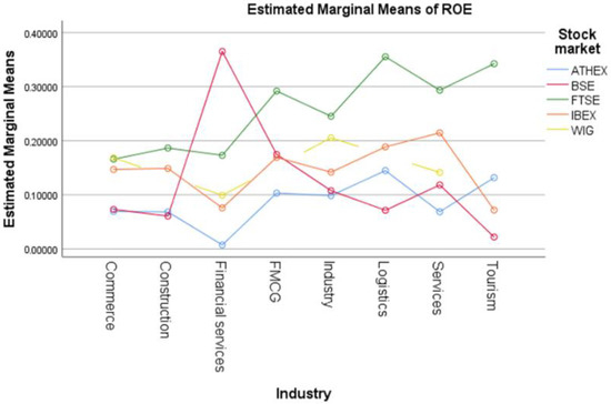 Marginal means of ROE, differentiated by stock market and area of activity.