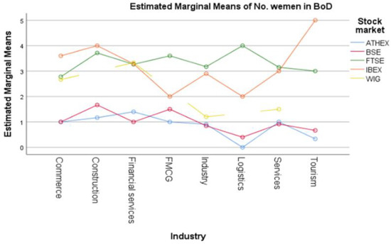 Marginal means of number of women on board, differentiated by stock market and sector.
