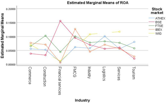 Marginal means of ROA, differentiated by stock market and area of activity.
