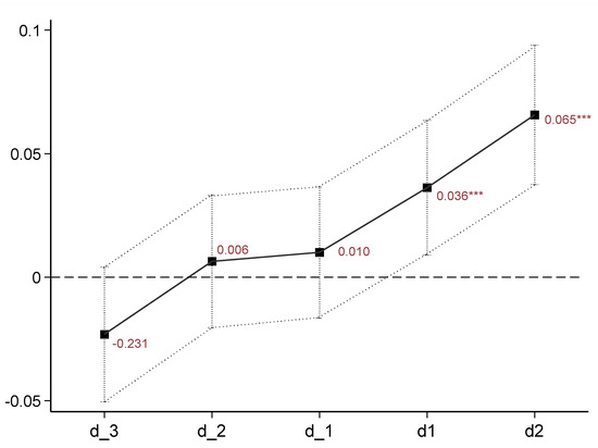 Our identifying assumption was that the control group would have a similar trend as the treatment group if there were no SEZs. If there was an expectation on the establishment of the SEZs, it may lead to the treatment and control group ex ante non-comparable and bias estimates. To check whether a common trend exists between treatment and counterparts, we conducted a pre-trend check following Topalova [65]. In particular, we checked whether the control and treatment groups had the same trend in the pre-treatment period. In practice, we extended the DID specification to an event-time specification [66]. Specifically, we should add to the regression a series of year-wise dummies for additional control, assigning a pre-SEZs period as the time of treatment. We considered a 5 year window, spanning from 3 years before SEZs establishment until 2 years after as the following specification: