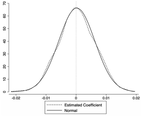 When SEZs expanded rapidly, China’s economy also developed rapidly, which indicates that the number of FIEs may increase even without SEZs policy. We must determine whether unobservable factors are simultaneously influencing FDIs. To alleviate this identification concern, we used the method by Lu et al. [67] to conduct a placebo test by randomly selecting a fake treatment group and a fake post time. Subsequently, we constructed a counterfactual DID term, SEZfalsec × POSTfalsect, from two stochastic indicators. The randomness of the POST and SEZ variables ensures that the fake DID estimator should have no impact on the FDI, which means the estimated coefficient should be around zero. Otherwise, it indicates the existence of the omitted variables. To enhance the credibility of the placebo test, we conducted random simulations 1000 times and plotted the estimated coefficient distribution curve. The distribution results are shown in Figure 2 which is concentrated around zero. The placebo test shows that regression is barely affected by unobserved variables.