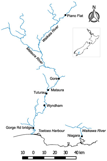 The Matāura River originates near Eyre Peak in the Taka Ra Haka Conservation Park (Eyre Mountains) located to the west of the Kingston arm of Lake Wakatipu in Northern Southland. The headwaters are fed predominantly by rainfall, with a significant spring snowmelt contribution to the springtime flow. The Waikaia River is the largest of the Matāura’s numerous tributaries, comprising just over half of the catchment area (1360 km2) at their confluence [1,2]. From Gore, the Matāura River flows south through a long fertile river plain where it becomes more entrenched and its gradient gradually decreases before entering the Toetoes Estuary, a small lagoon-type estuary, prior to discharging into the sea at Fortrose at the bottom of the South Island [2]. The Matāura River and its tributaries have long been valued worldwide by sports fisherman for the quality of the brown trout fishery it maintains.