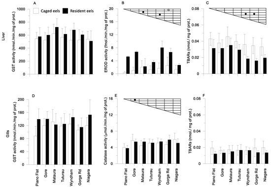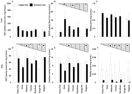 Biomarkers (A,D): GST; (B): EROD; (C,F): TBAR; (E): catalase measured in caged and resident eels’ livers and gills in summer at the seven sites. (Statistical significance (p < 0.05) between sites is indicated for ○ caged and ● resident eels.).
