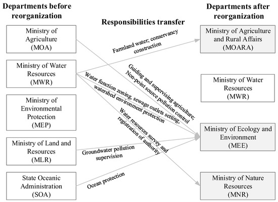 To cope with serious water pollution, the State Council of China issued the Action Plan for Prevention and Control of Water Pollution (APPCWP) in April 2015 [1]. The plan consists of 10 primary water management responsibilities (including comprehensive control of pollutant emissions and promotion of economic restructuring, water protection and conversation, etc.), involving more than 30 management departments (including the Ministry of Environmental Protection (MEP), Ministry of Water Resources (MWR), Ministry of Land and Resources (MLR), etc.). APPCWP established common goals as a typical collective action under the government’s mandatory orders and transparent responsibilities [2]. However, such large groups’ higher organizational expenses also contribute to less cost-effective than other small groups [3,4]. Specifically, excessive management departments engaged in similar water management responsibilities would encounter many problems, such as overlapping functions and inefficient management. APPCWP involves over ten leading departments associated with each other regarding water pollution control. The Ministry of Water Resources and the Ministry of Environmental Protection have severe conflicts and overlaps in the protection of water resources and the prevention of water pollution.