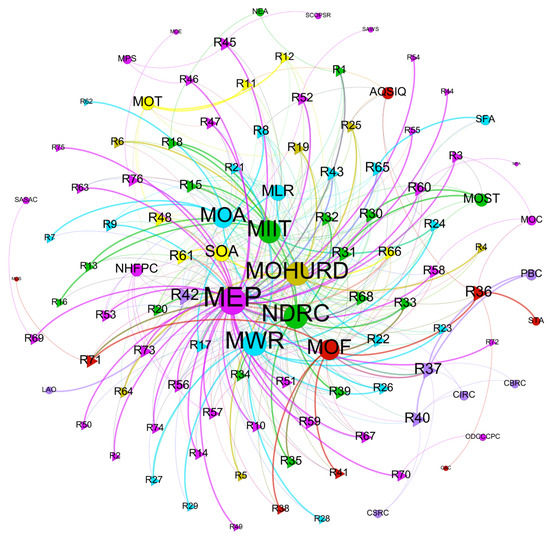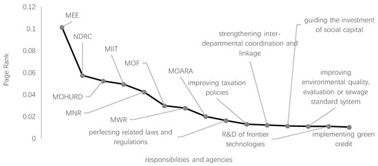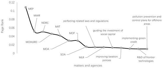 From the ranking of the top nodes, the essential departments in the Chinese water management network before the department restructuring were Ministry of Environmental Protection (MEP), Ministry of Water Resources (MWR), and other seven agencies (see Figure 2). These results suggest that the core management responsibilities improve related laws/regulations and taxation policies. They imply that many significant ministerial agencies were involved in water management in China. The laws and regulations, finance and taxation, R&D and departmental cooperation are the key tasks for APPCWP.