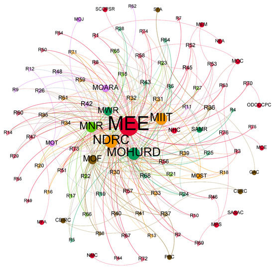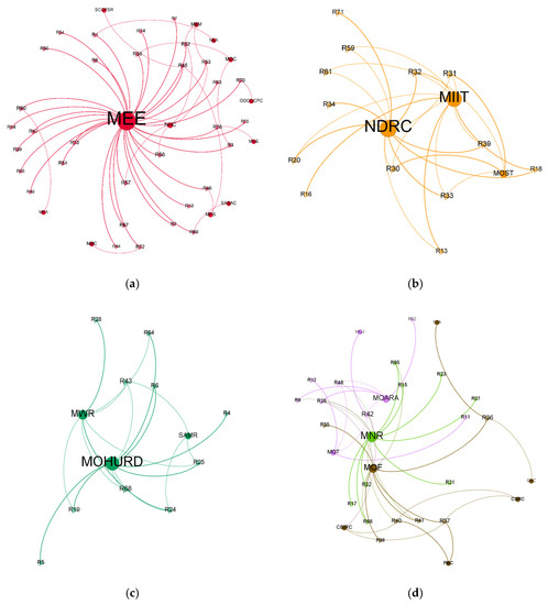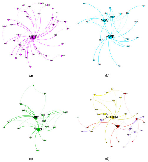 According to the theory of block model, a certain degree of structural equivalence between the sub-nodes exists in the same module, implying that some management departments are redundant in the same module. We can see from the first module (Figure 5a; in purple, with 36.45% of nodes), the core government agency is the Ministry of Environmental Protection (MEP), which is in charge of most of the responsibilities about water pollution and protection. The main government agencies in the second module (Figure 5b; in blue, contains 17.76% of nodes) are the Ministry of Agriculture (MOA), Ministry of Water Resources (MWR), and Ministry of Land and Resources (MLR). The sub-network is centered on the Ministry of Water Resources (MWR), which is mainly responsible for saving and protecting water resources. The Ministry of Water Resources (MWR) and Ministry of Land and Resources (MLR) play key roles in controlling groundwater overexploitation and protecting ecological space, respectively. At the same time, the Ministry of Water Resources (MWR) and Ministry of Agricultural (MOA) are related to the management of agricultural water-saving and non-point source pollution. In the third module (Figure 5c; in green, with 16.82% of nodes), the main government agencies are the Ministry of Industry and Information Technology (MIIT), National Development and Reform Commission (NDRC) and Ministry of Science and Technology (MOST). The two major administrative departments of the NDRC and MITT cooperated closely in eliminating outdated industrial capacity, optimizing the spatial distribution, and promoting the exit of polluting enterprises. These promote the transformation of economic institutions. To strengthen science and technology support management, the MITT and NDRC cooperated closely in dissemination demonstration and appropriate technologies, R&D frontier technologies, and vigorously developing environmental protection industries. Since the nodes of modules 4–7 are relatively small (i.e., 8.41%, 7.48%, 6.54%, and 6.54%, respectively), they are shown in a sub-graph (Figure 5d). The functions of the Ministry of Transportation (MOT) and the State Oceanic Administration (SOA) overlap in several aspects (i.e., ship pollution treatment, enhancing the ability to prevent, and control of the port and terminal pollution). There are overlapping functions in the management of capital and green credit and guiding the investment of social capital among the People’s Bank of China (PBC), China Securities Regulatory Commission (CSRC), China Banking Regulatory Commission (CBRC), and China Insurance Regulatory Commission (CIRC).