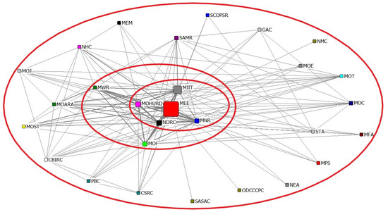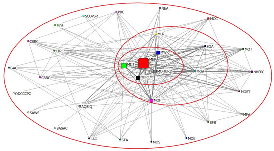 Figure 8 and Figure 9 display the two water management agency networks with obvious core-periphery structure. Regarding the network before department restructuring, the Ministry of Environmental Protection (MEP), Ministry of Water Resources (MWR), Ministry of Housing and Urban-Rural Development (MHURD), Ministry of Industry and Information Technology (MIIT), National Development and Reform Commission (NDRC) are in the first core circle. The Ministry of Finance (MOF), Ministry of Agriculture (MOA), State Oceanic Administration (SOA), and Ministry of Land and Resources (MLR) are in the intermediate transition layer. The other twenty-two agencies are in the edge position of the water management system.