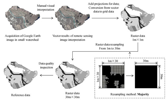 Research has shown that Google Earth images with high resolution can be an important data source to evaluate the accuracy of land cover products [30,31]. The reference datasets in this study were the results of manual visual interpretation of 20,936 sampling units based on high-resolution remote sensing images from Google Earth. Figure 2 displays the specific processing flow of the reference data in this study. There were four main steps, interpretation of remote sensing images, conversion of projection and data format, scale transformation of raster data, and data quality inspection. In the study area, more than 78% of the sampling units had remote sensing images with a sub-meter resolution. In the other 22% of the sampling units, the spatial resolution of the remote sensing images could also reach the meter level. To maintain the consistency of image time with the FROM-GLC30 2017 dataset, most interpretation of the reference data was based on Google Earth images around 2015. Google Earth images with different years and seasons were also utilized to improve the accuracy of the interpretation results of the time-sensitive land cover types (such as water bodies, glaciers, and permanent snow). The visual interpretation accuracy met requirements of 1:10,000 scale, and the reference data were unified into grid data of 1 m resolution after format conversion. The reference data and the data to be assessed need to be consistent in scale for data accuracy assessment. For this study, the grid size of the reference data was transformed from 1 m to 30 m by scale transformation. The resampling method was Majority. That means the land cover type of each 30 m grid cell after resampling is consistent with that accounting for the largest proportion of the corresponding 900 grid cells with 1 m resolution. After resampling, the attribute values of each 30 m by 30 m grid unit were consistent with those occurring most in the 900 grid units with a size of 1 m by 1 m (Figure 2).
