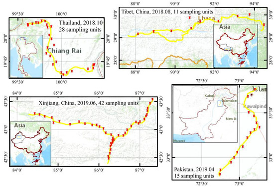 In order to improve the quality of the reference data, four field surveys were organized in Thailand, Pakistan, Tibet, and Xinjiang, China in 2018 and 2019. Based on the field survey of 53 small watershed sampling units (Figure 3), the land cover interpretation results were verified. According to the results of field surveys, some common errors in the interpretation were identified. For example, in the Tibet Plateau, the most common mistake was to interpret grassland as bareland. In images, many objects look like bareland in color but are actually low cover of grassland at high elevation. After the field survey, the reference data were revised according to the common errors not only at the surveyed SUs but also at SUs with similar conditions in the same regions. That helped improve the reference data.