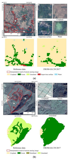 The reference land cover data was originally derived for the land cover interpretation in a Pan Third-Pole erosion project, rather than within the specific research study presented here. One change was made, as described earlier, to the resolution of the dataset from 1 m to 30 m in order to make sure the accuracy was calculated at the same scale as the FROM-GLC30 1017 dataset. In addition, based on the original project requirements, the land cover classification system of the reference data was more focused on regional soil erosion and its applications. As it differed in details from the land cover classification system of the FROM-GLC30 2017 dataset, the classification system of the two datasets needed to be partially consolidated and some categories mapped. The unified classification system included cropland, forest, shrubland, grassland, impervious surface, water, and bareland. Table 1 shows the correspondence of the classification system between the FROM-GLC30 2017 dataset and the reference data and describes the definition of the unified seven land cover types. Figure 4a,b displays the comparison of Google Earth images, interpretation results, the reference data, and the FROM-GLC30 2017 dataset of two sampling units under the new classification system.