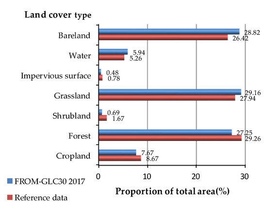- In the study area, the proportion of land cover types in the FROM-GLC30 dataset was similar to that in the reference data. The difference between the two datasets for all the land types was small.