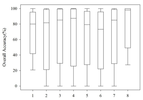 Box-plot of overall accuracy in eight regions. Regions: 1: Central and Eastern Europe; 2: Central Asia; 3: China; 4: Mongolia; 5: Russia; 6: South Asia; 7: Southeast Asia; 8: West Asia–Northeast Africa.