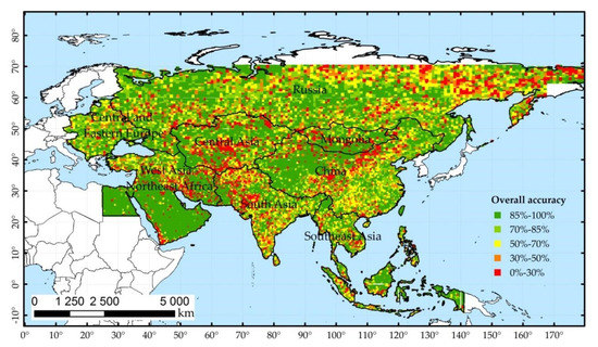 Figure 8 displays the spatial distribution of the overall accuracy or geometric center of each sampling unit. The sampling units with higher overall accuracy (85–100%) were mainly distributed in northwestern China, central and northwest Russia, southern West Asia–Northeast Africa, and parts of the border between Central Asia and West Asia–Northeast Africa. The sampling units with lower overall accuracy (0–30%) were mainly concentrated in central and northern China, the central and southern regions of Central Asia, and the southwestern regions of South Asia. The findings show that the overall accuracy of the sampling unit has regional differences, which may be related to the complexity of the land cover composition in different regions.
