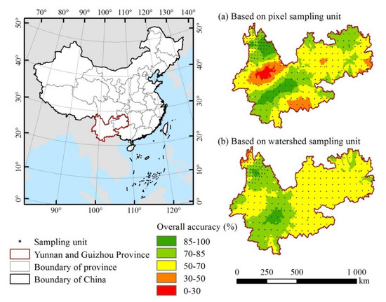 To further illustrate the ability of the methods to express the spatial differences of regional land cover accuracy based on small watersheds sampling units and pixels, this study carried out validation experiments in Yunnan and Guizhou Province. In the experimental area, 85% of the sampling units (212) were randomly selected as sample sets for the overall accuracy interpolation, and the remaining 15% of the sampling units (37) were used as verification samples for the comparison with the accuracy interpolation results. Root Mean Square Error (RMSE) between the verification sampling units accuracy and interpolation results was calculated based on small watersheds and pixels respectively. The smaller the RMSE was, the better the sampling method was for accurate expression of the spatial accuracy difference. The results showed that the RMSE based on the small watershed units was 21.2%, and the RMSE based on pixel units was 42.7%. In summary, there was not much difference between the overall accuracy values based on small watershed unit and pixel unit. However, taking small watersheds as the sampling units could better reflect the difference of classification accuracy spatially.