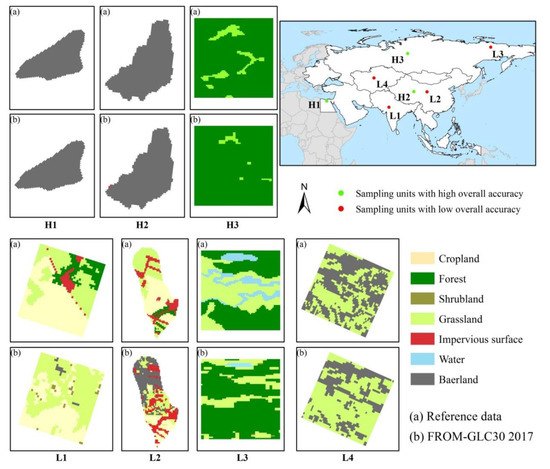 According to the spatial distribution results of the overall accuracy in each sampling unit, the accuracy of the FROM-GLC30 2017 dataset in different regions was quite different. In Section 3.2, Figure 8 shows that the overall accuracy of sampling units in northwestern China, central and northwest Russia, south of West Asia–Northeast Africa, and parts of the border between Central Asia and West Asia–Northeast Africa was high, being more than 85%. The possible reason is that these areas generally have wide area and sparse population, and the composition of land cover type is often single with a large coverage area. In these places, different land cover types are usually distributed in concentrated and contiguous units, mostly consisting of desert, bareland, forest, grassland, or cropland. These land cover types have unique colors, shapes, and texture features in remote sensing images, which are easy to distinguish, so the overall accuracy of these areas is relatively higher (Figure 10, H1–H3).