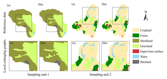 According to statistics, there is little difference in the area proportion of each land type before and after the scale transformation. However, in both sampling units, some patches become scattered, and the location of some patches changes. These changes are caused by the scale transformation from 1 m to 30 m and may certainly have an effect on the accuracy results for sampling units. In further research, the mechanism of the scale effect and its influence on the accuracy of land cover data should be further explored.