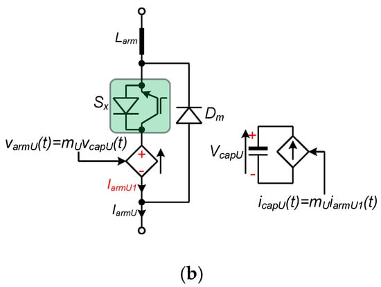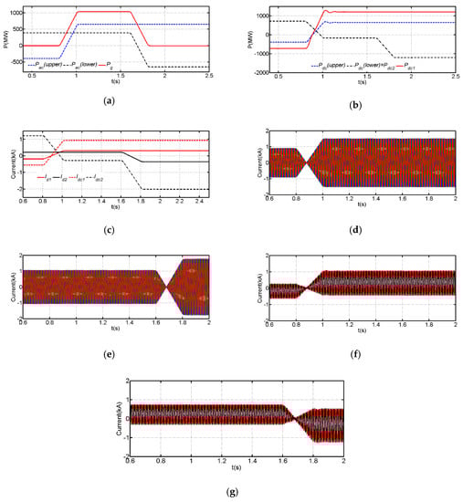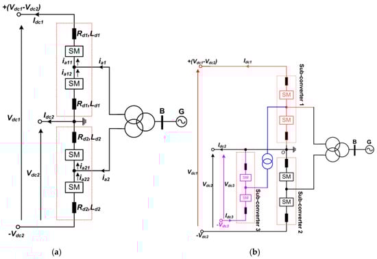 - In line with above discussions, the arm currents of the upper and lower sub-converters in Figure 3f,g confirm the point made earlier with regard to no excessive current stresses are observed in the sub-converters despite the large current in the DC link of the low-voltage DC terminal.