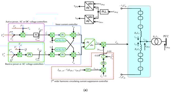 - Per phase-leg proportional-resonant controllers tuned at double power frequency are included in each sub-converter as shown in Figure 2 to estimate the required 2nd order harmonic voltage to be injected into the common-mode loop in order to suppress the circulating currents in the MMC arms.
