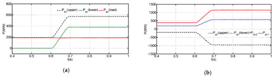 - The DC powers of the upper and lower sub-converters, Pdc(upper) and Pdc(lower) of the two-port system and monitored DC powers in the high and low voltage DC terminals Pdc1 and Pdc2 are shown in Figure 4b.