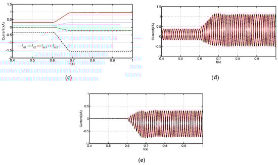 - The DC components of arm currents of the upper and lower sub-converters 1 and 2 superimposed on the DC currents of the high and low voltage DC terminals are shown in Figure 4c. Notice that no currents are observed in the lower sub-converters arms when its real power is controlled at zero, and its DC link current is not zero, i.e., Idc2 = −Idc1 and Id2 = 0, and Pdc(upper) ≈ Pdc(lower) plus AC load real power as shown in Figure 4a–c.