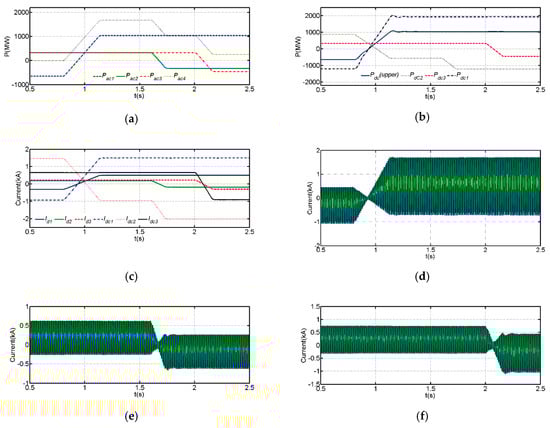 - Figure 5a,b shows that the power distributions in the tri-port converter in Figure 1b adhere to the same theoretical principles that govern the two-port system in Figure 1a, namely, Pac1 = (n − 1)/nPdc1 and Pg = Pac1 + Pac2 + Pac3. Notice that the DC power of the sub-converter 2 varies at t = 0.8 s with real power of sub-converter 1 (Pac1), and this is attributed to DC power exchange from sub-converter 1 to DC link of sub-converter 2, through the DC components of the arm currents of sub-converter 1, with the arm currents of sub-converter 2 remaining unchanged and merely determined by its real power (Pac2) as shown in Figure 5a–f.