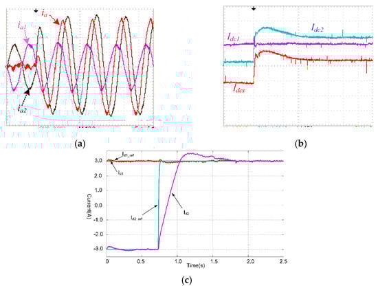 - Figure 3d,e depicts the three-phase output currents of the upper and lower sub-converters 1 and 2, and these results indicate the independent control of the sub-converters of the two-port system.