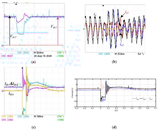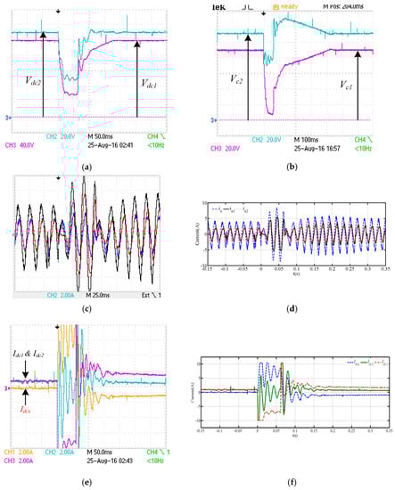 - Figure 8e,f displays experimental DC side currents, i.e., Idc1, Idc2, and Idcx, directly from scope and plotted from scope CSV data. These plots show both sub-converters 1 and 2 of the two-port system under investigation are affected by the DC fault at the high-voltage DC terminal, despite that sub-converter 2 has a separate DC source. Also recall that sub-converters 1 and 2 share the same common-mode currents, which cause fast and large rise of Idcx and Idc2. Notice that sub-converter 2 is exposed to relatively low current stresses compared to sub-converter 1, evidently from the DC link currents Idc1 and Idc2. Because of the current limiting inductors employed in the experimental test rig and shown in Figure 6a, observe that the DC current Idcx exhibits a rapid current rise and followed by an extended period of oscillatory and slow decaying to pre-fault level, which started even before the fault is cleared.