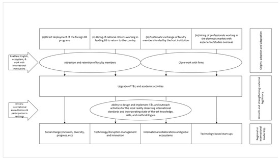- de Freitas, M.E.; Bertero, C.O.; Fleury, M.T.L.; Mariotto, F.L.; Silva, A.L. Process of internationalization of business schools in Latin America: The case of EAESP/FGV, Brazil. Tert. Educ. Manag. 2016, 22, 267–286. [Google Scholar] [CrossRef]