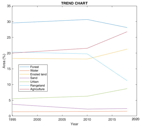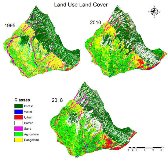 The LULC classification for the study period was obtained using supervised classification, as represented in Figure 3. The study area was divided into seven classes, i.e., forest, water, sand, eroded land, urban, rangeland and agriculture. Table 1 reveals the percentage area covered by each class for the years 1995, 2010 and 2018.