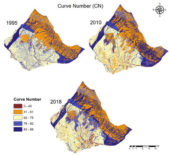 The computation was performed to analyze the impact of climate change and anthropogenic activities on the regional surface runoff potential. The study infers that runoff increased approximately 48% from 1995 to 2010 and 71% from 2010 to 2018 (Figure 8). The values of weighted CN are 69.24, 70.96 and 71.24 for 1995, 2010 and 2018, respectively.