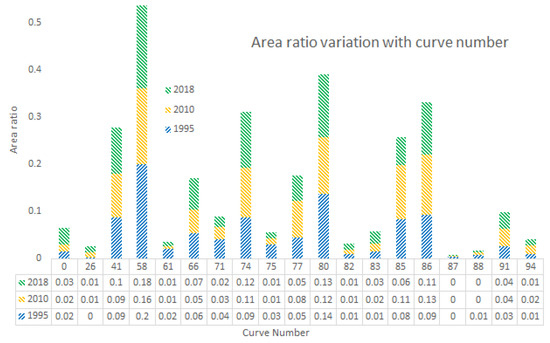 Variation of area ratio with Curve Number for the years 1995, 2010 and 2018.