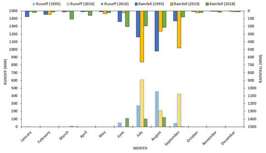 Rainfall and runoff variation in the study region for the years 1995, 2010 and 2018.