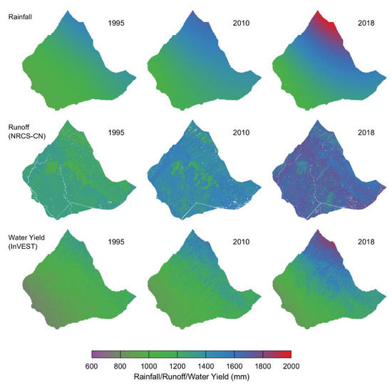 The CN values were found to have very little temporal variability for the study area (Figure 7). This suggested that LULC, soil map or variations in land-use class have low influence on surface runoff. Changes in the rainfall pattern and intensity are solely responsible for the flooding condition in the study region. The city experiences runoff mainly during July to September. In July, runoff was maximum in 2010 (approximately 100% greater than in 1995 and 245% greater than in 2018). Subsequently, flooding can be mitigated by implementing water harvesting schemes at the specified areas that experience high surface runoff. Furthermore, to validate the annual spatial trend of runoff, the InVEST model is applied to estimate the annual water yield.