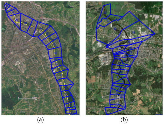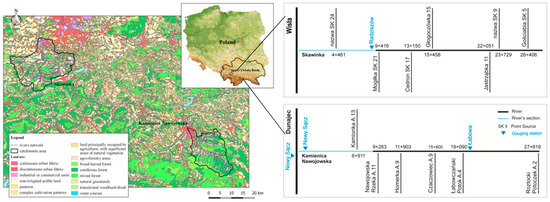 The study regarded two catchments of the Upper Vistula basin: Skawinka and Kamienica Nawojowska. The Upper Vistula basin accounts for about 25% of the entire Vistula basin and about 15% of Poland’s area and covers the south-eastern region of the country. It covers part of the Carpathians, Subcarpathian valleys, and Małopolska Uplands. The Upper Vistula basin area shows large variations in elevation [21]. Physiographic parameters of the studied catchments (Skawinka and Kamienica Nawojowska, respectively) are: catchment area (A) 316.0 and 238.0 km2, main river length (L) 34.0 and 33.1 km, average main river slope (I) 10.3 and 17.3‰, average catchment slope (Ψ) 18.6 and 31.0‰, soil imperviousness index (N) 34.0 and 33.0%, and runoff coefficient (Φ) 0.62 and 0.82. The Skawinka catchment area includes agricultural areas (75.6%), forests (20.8%), and artificial surfaces (3.6%). The Kamienica Nawojowska catchment is characterized by forests and seminatural areas (58.6%), agricultural areas (36.4%), and artificial surfaces (5.0%). The studied catchments have a different hydrographic system and the analyzed zones include estuary river sections with a length of about 9 km (Figure 1). The layout of the river network indicates differences between Kamienica Nawojowska and Skawinka. The tributaries of Kamienica are concentrated in the central part of the basin and the supply is mainly on the left bank. Skawinka has tributaries distributed more evenly along the entire length.