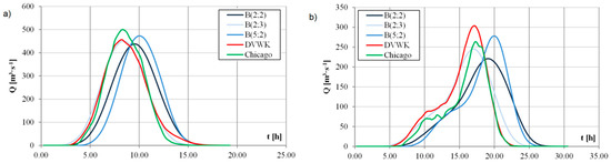 The EBA4SUB model was used to determine the design hydrographs to be propagated at the beginning of the investigated river sections. Hydrographs were determined for the following gross rainfall distributions: beta, DVWK, and Chicago. The characteristics of the modelled design hydrographs are presented in Table 2. The hydrographs shapes are shown in Figure 2a,b.