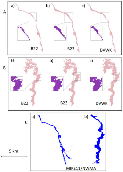 (A) Flood-prone areas; the Kamienica Nawojowska River—FLO-2D: (a) B(2;2), (b) B(2;3), (c) DVWK (we report only the cases with the major differences). (B) Flood-prone areas; the Skawinka River—model FLO-2D: (a) B(2;2), (b) B(2;3), (c) DVWK (we report only the cases with the major differences). (C) Flood-prone areas; Mike11/NWMA: (a) Kamienica Nawojowska, (b) Skawinka.